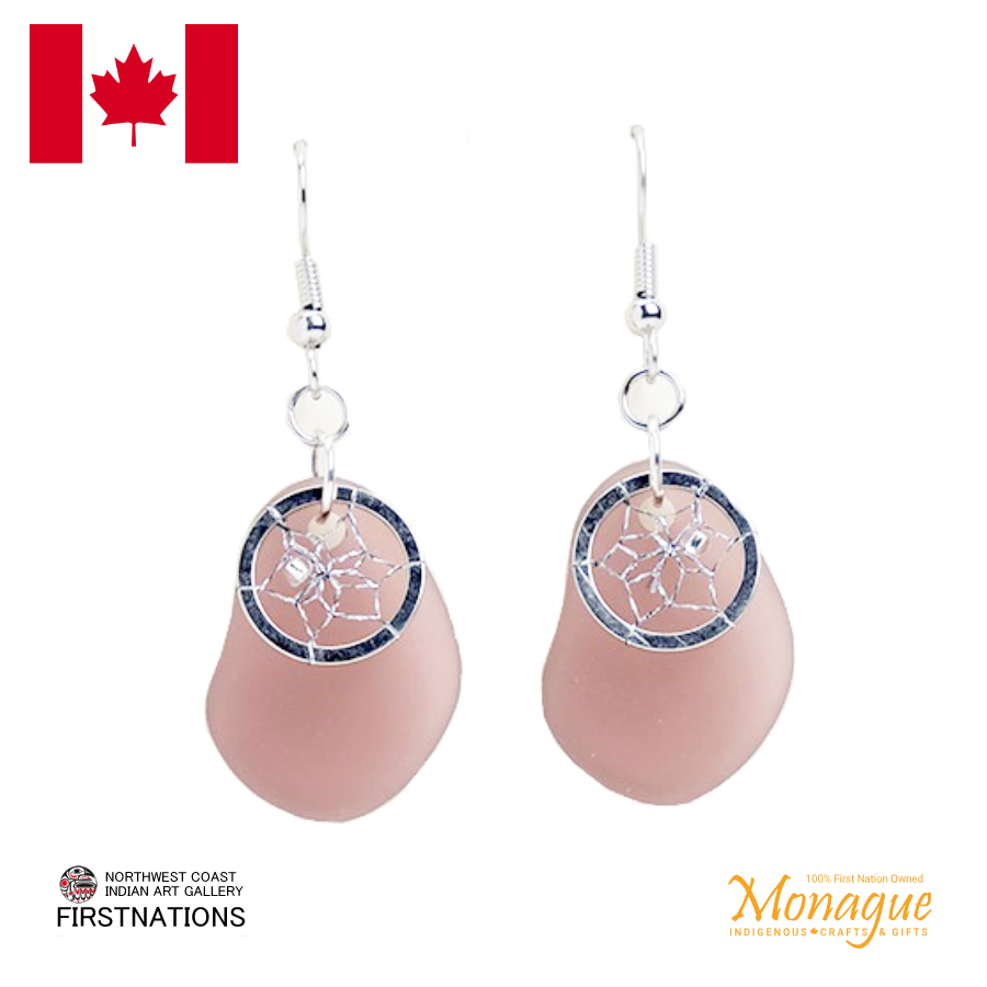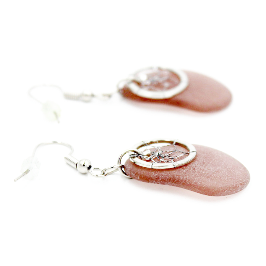 ■商品説明:ドリームキャッチャー発祥の地、北米オジブア族インディアンのハンドメイド作品です。夢の世界へ旅立つ魂のお守りであるドリームキャッチャーを形どったアクセサリーです。またシーグラスは、海岸や大きな湖の湖畔で見付かるガラス片のことで、波に揉まれて角の取れた小片となり、曇りガラスのような風合いでとっても可愛いんです。見た目によらず軽いので装着が楽です。