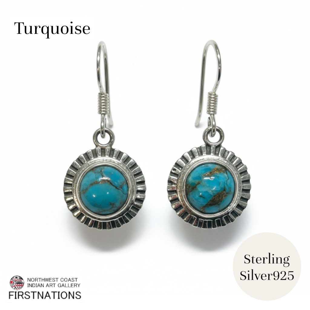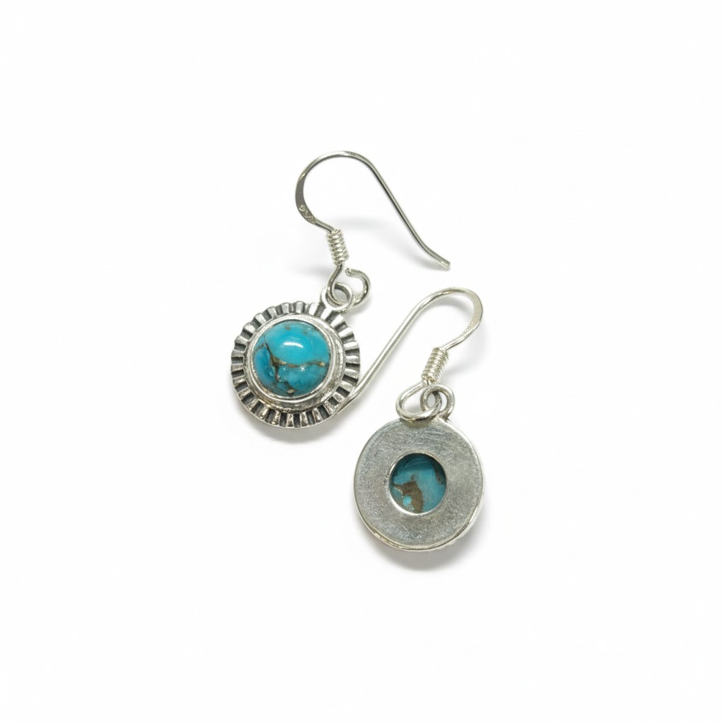 ■ 商品説明:本品は、アフガンターコイズ(Afghan Turquoise)を使用したシルバーピアスです。アフガンターコイズはアフガニスタンで産出されるターコイズで、鮮やかなブルーとマトリックス模様が特徴です。流通量は多くなく、特に色味や質感の良いものはアクセサリー用として大切に扱われています。中央に、発色の良いアフガンターコイズのラウンドカットを配置し、その周囲を放射状のフレーム装飾で縁取った、クラシカルでありながら存在感のある一点物ピアス。量産品にはない立体感と存在感があります。