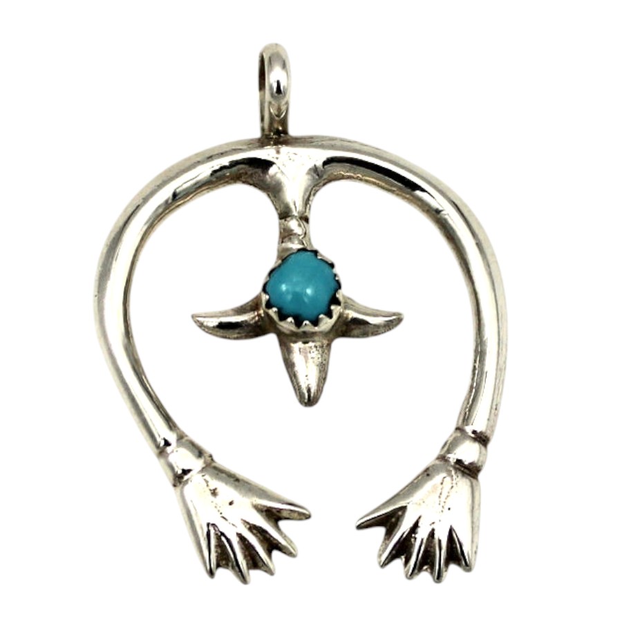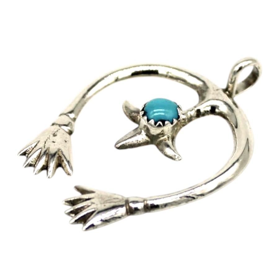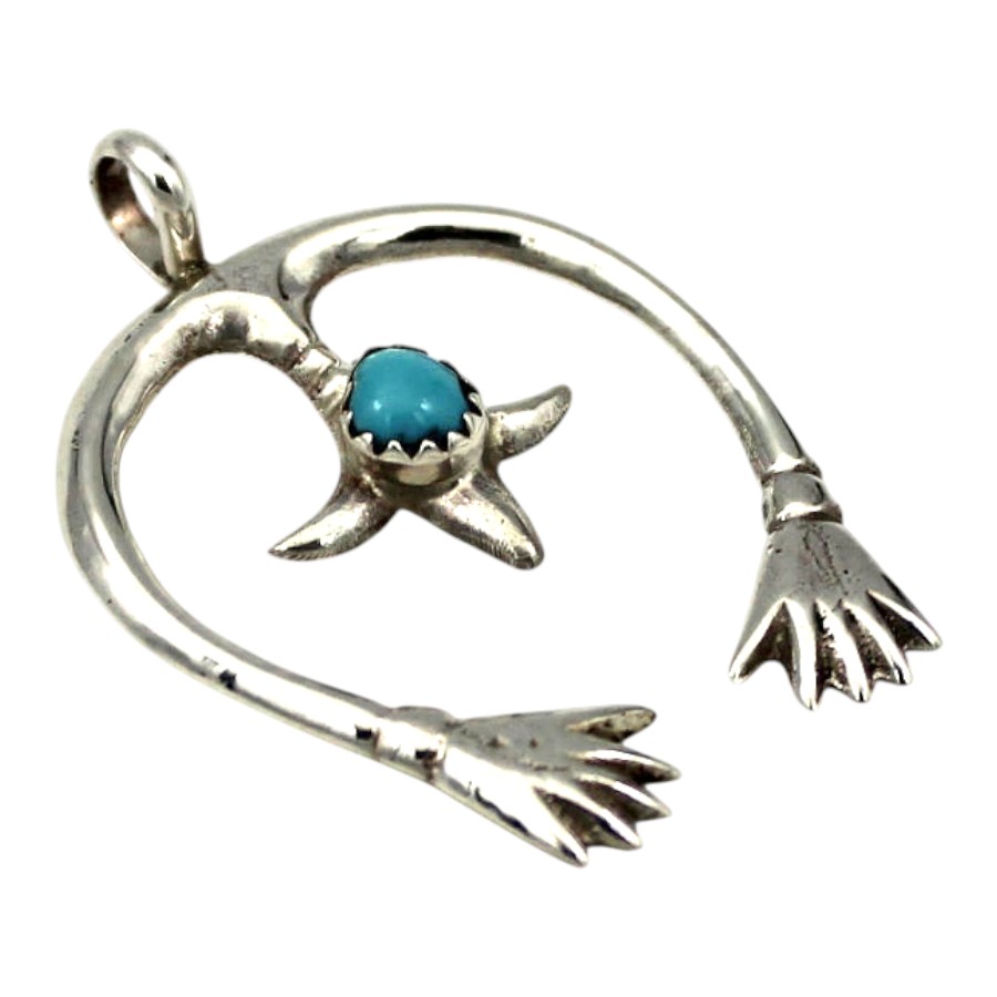 ■商品説明: ナバホ族 Lorraine Cheeによるハンドデザイン型のペンダントです。中央にターコイズがあしらわれたユニークなデザインです。