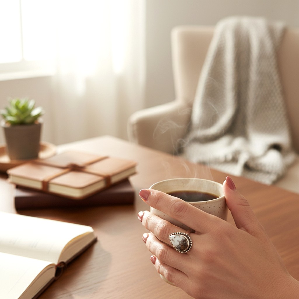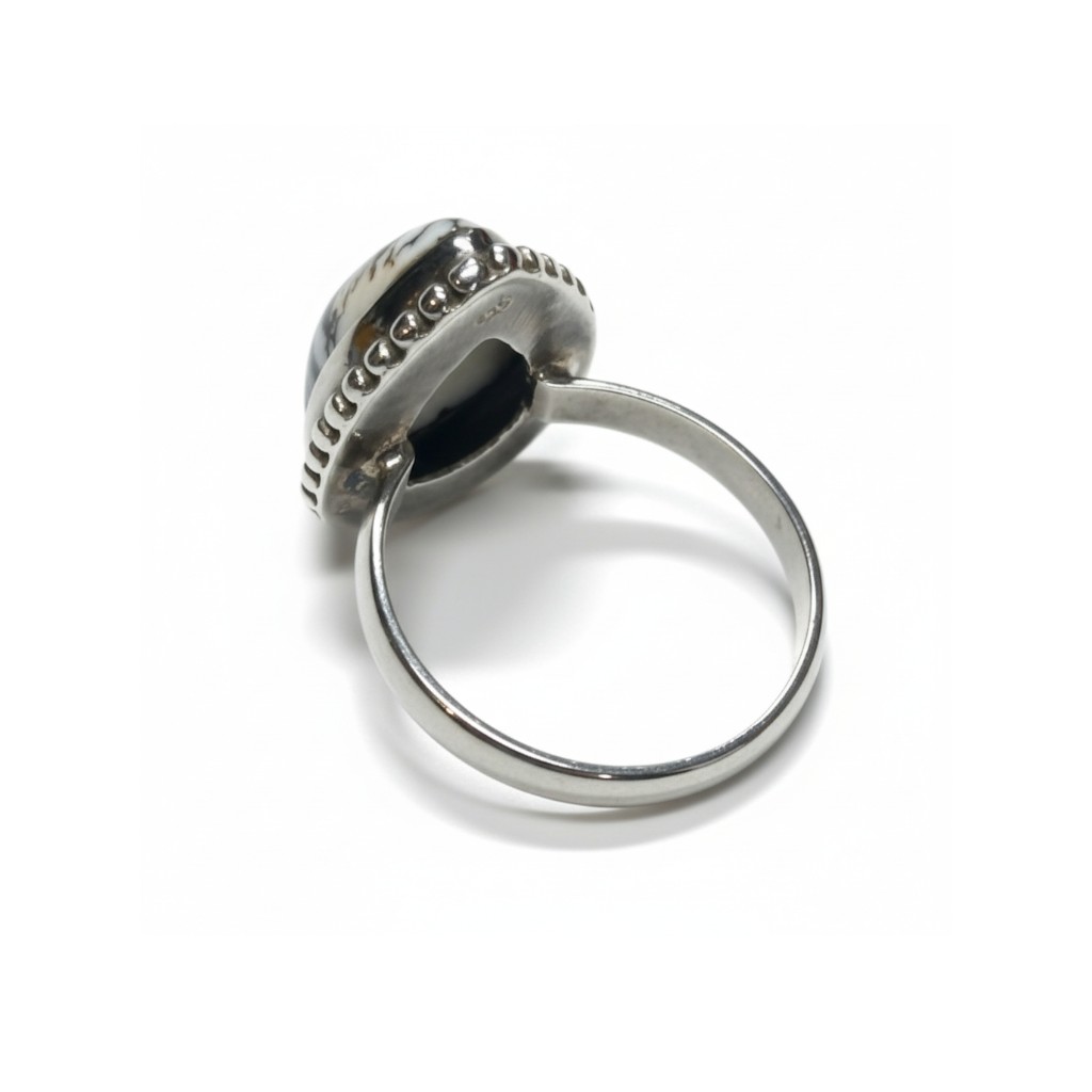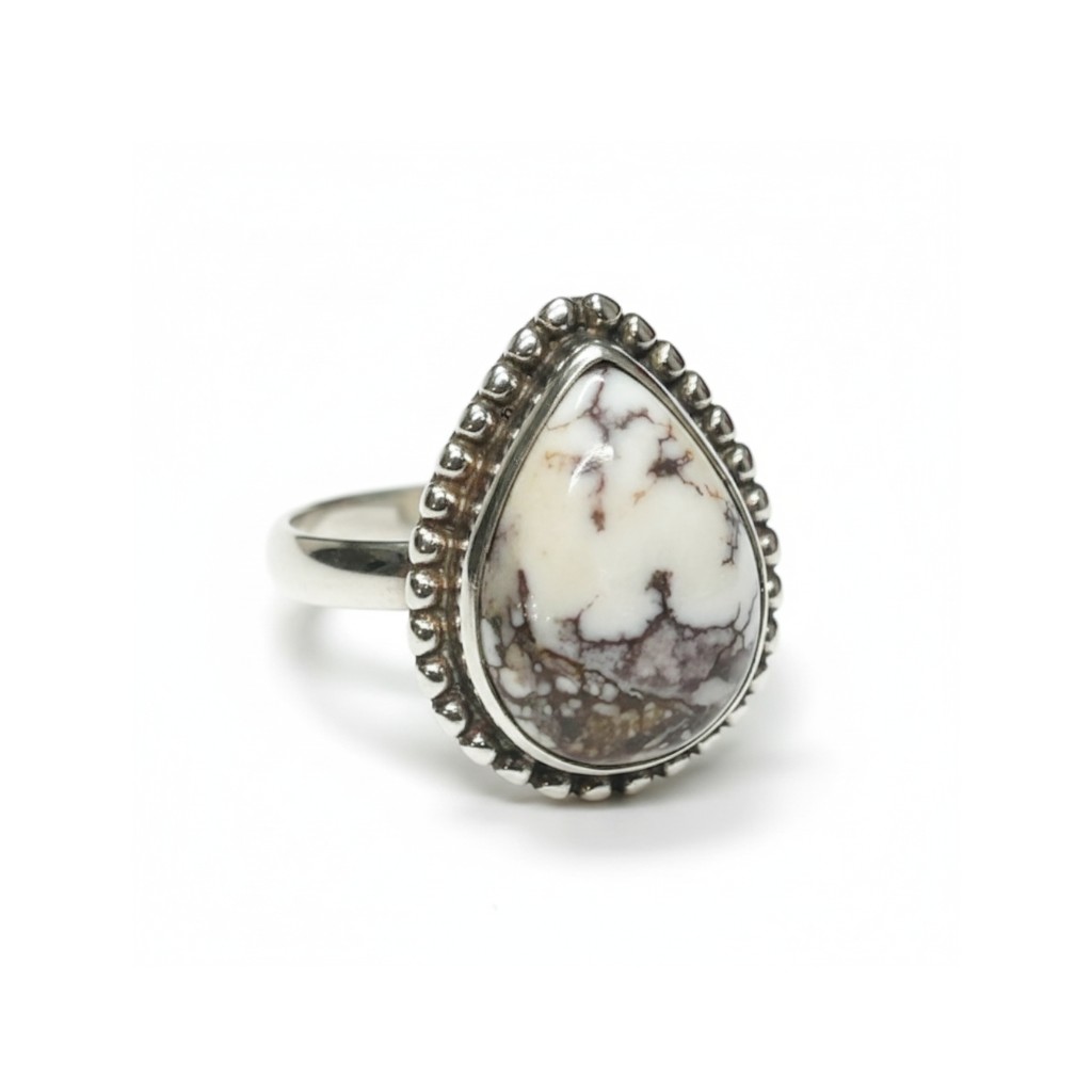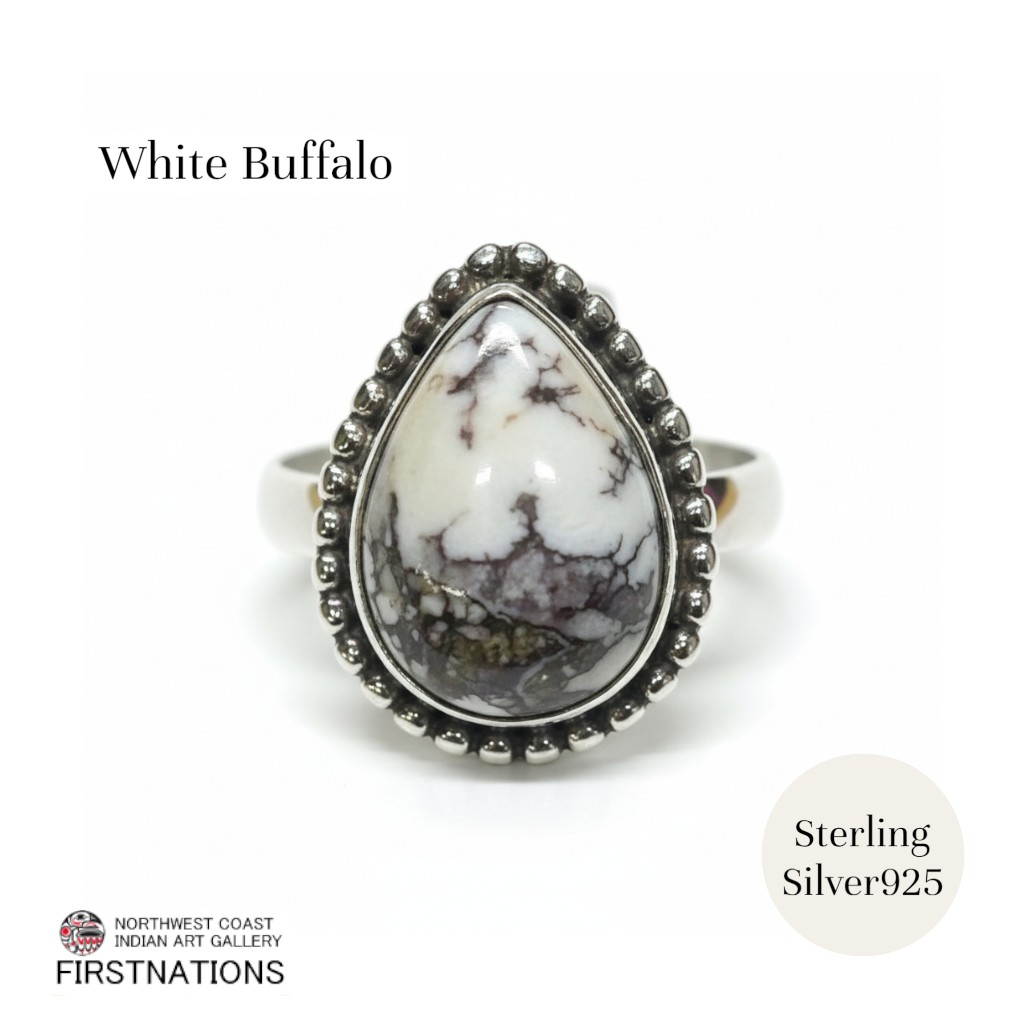 ■ 商品説明:ネイティブアメリカンジュエリーの中でも、近年は採掘量が少なく、流通数が限られているとされるホワイトバッファローを使用したシルバーリングです。ホワイトバッファローは、ターコイズと同系統の鉱脈から産出される天然石で、純白からグレー、ブラックのマーブル模様が特徴。一つとして同じ模様はなく、天然石ならではの個体差を楽しめます。リング枠にはSterling Silver(シルバー925)を使用。程よいボリューム感がありながら、指に自然に馴染むデザインで、カジュアルからシンプルな装いまで幅広く合わせていただけます。